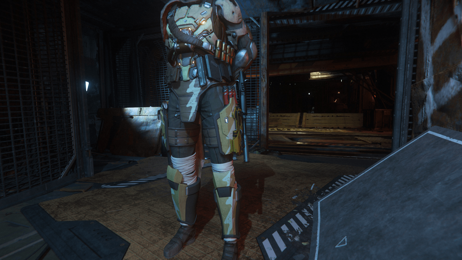 This armor was created using repurposed parts from a Caldera armor set to provide the wearer with an extra layer of protection against aggressors and harsh environments.